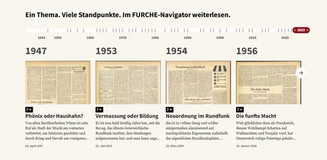 Digital verknüpft. Seitdem ist viel passiert. Heute, neun Chefredakteure und eine Chefredakteurin später, blickt Die Furche auf abertausende Reportagen, Kommentare, Porträts und andere Textformen gesellschaftlichen, politischen, kulturellen und vor allem religiösen Inhalts zurück. Auch, wenn die Wochenzeitung jeden Donnerstag großformatig in Papier erscheint: Seit Jahren schon wird zusehends – und ansprechend – „digitalisiert“. Laut Medienanalyse bietet Die Furche ihren AbonnentInnen bereits Ende 2022 anhand von 175.000 seit 1945 publizierten Beiträgen, einen „digitalen Reiseführer durch die Zeit“. Der „Furche-Navigator“ verknüpft dabei „die vielfach von prominenten Intellektuellen verfassten Artikel inhaltlich und macht Zusammenhänge sichtbar“, erklärt Doris Helmberger-Fleckl, die seit 2019 Chefredakteurin ist, auf katholisch.at.