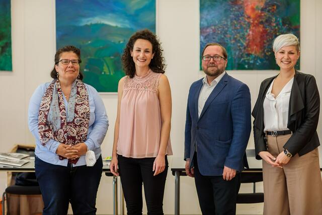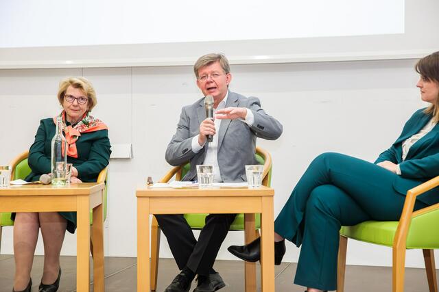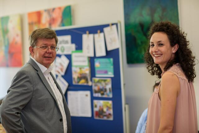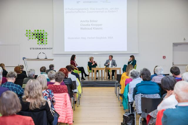 - Waltraud Klasnic, Frau Landeshauptmann a. D. (links), und Caritas-Vizedirektorin Nora Tödtling-Musenbichler (rechts) im Gespräch mit karitativ Engagierten.