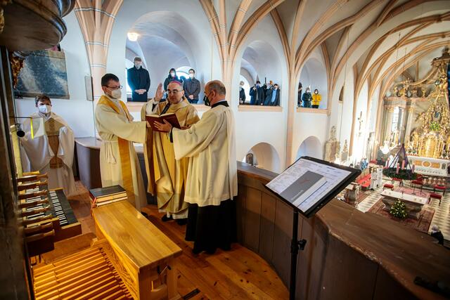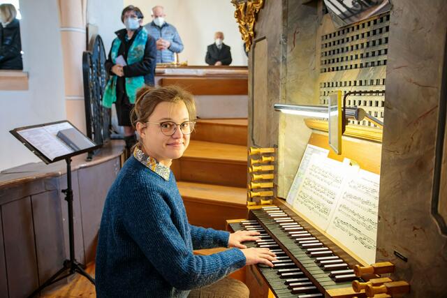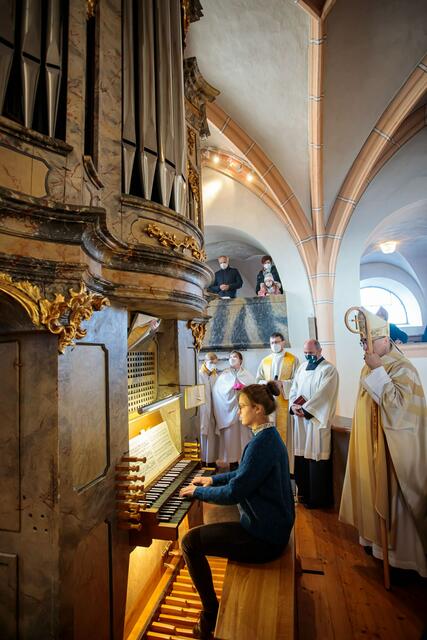 Zur Segnung am 8. Dezember, Hochfest Mariä Empfängnis, konnte Pfarrer Johannes Lang Bischof Wilhelm Krautwaschl willkommen heißen. Nach der Predigt wurde das erneuerte Instrument gesegnet und von Lena Suppan zum Klingen gebracht.
