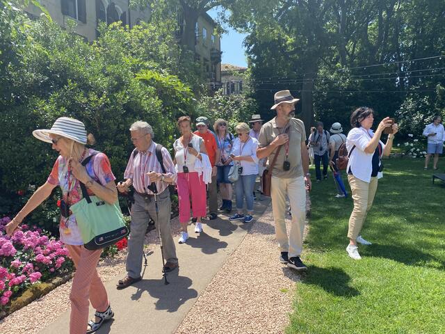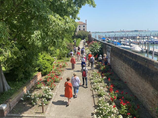 Venedig. Von unserem Hotel in Treviso geht es mit dem Zug nach Venedig. Der erste Garten in Venedig liegt im Viertel Cannaregio. Der Palazzo Contarini dal Zaffo mit seinem wunderschönen Garten liegt direkt am Canal Grande. Der Garten wird heute von Klosterschwestern betreut. Zum nächsten Garten sind es nur ein Paar Schritte zu Fuß ins Hotel Palazzo Rizzo Patrol. Der kleine Rundgang durch dieses grüne Kleinod ist wirklich beeindruckend und von außen kaum vorstellbar. Zur Erfrischung erwartet uns dort ein kleiner Aperitif.