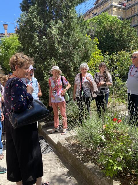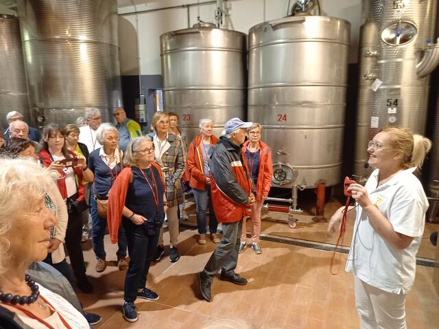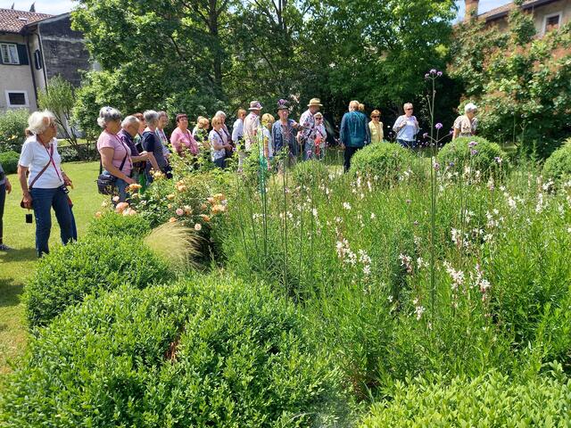 Udine. Eine unserer letzten Stationen ist die Besichtigung eines Privatgartens in der Nähe von Udine. Wir werden herzlich von der ORF-Journalistin Gisela Hopfmüller empfangen und durch ihren wunderbaren Garten geführt. Das mäßig gute Wetter tut der Begeisterung keinen Abbruch. Neben Olivenbäumen findet man auch eine Reihe von Weinstöcken zur Eigenproduktion. Am Ende dieser Besichtigung überzeugen wir uns selbst von dem Geschmack des Weines.