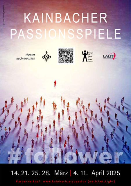 # followerBarmherzige Brüder Kainbach: Was bringt uns dazu, alles stehen und liegen zu lassen, um jemandem zu folgen? – Das inklusive Theater nach draußen fragt: Was bedeutet es, ein Follower zu sein – zwischen Einflüssen der digital vernetzten Welt und den zeitlosen Fragen nach Vertrauen, Verrat und Hingabe? 14., 21., 28. März, 4. und 11. April, jeweils 19.30 Uhr; 25. März um 14 Uhr; Freizeit- und Kulturhalle, Johannes-von-Gott-Straße 12, Kainbach bei Graz. Karten: Tel. 0316/3010 81,...