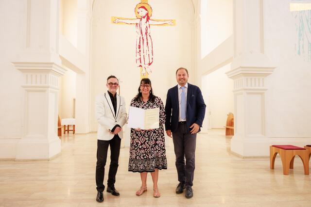 Ihr Dekret mit der Missio canonica für den Religionsunterricht erhielt aus den Händen von Bischof Wilhelm Krautwaschl Isabella Kerschbaumer, die nun in der Mittelschule St. Anna am Aigen Religion unterrichten wird. Links im Bild Personal-referent und Stellvertretender Schulamtsleiter Vinzenz Wechtitsch. | Foto: Neuhold