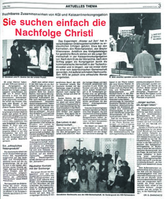 Am 2. Mai 1982 berichteten wir vom fruchtbaren Zusammenwirken von Katholischer Glaubensinformation und der Kalasantinerkongregation. 23 junge Männer haben sich seit 1975 zum Eintritt in die „Kongregation der frommen Arbeiter unter dem Schutz des Heiligen Joseph Calasanz“ entschlossen, die 1889 von P. Anton Maria Schwartz in Wien gegründet worden war.