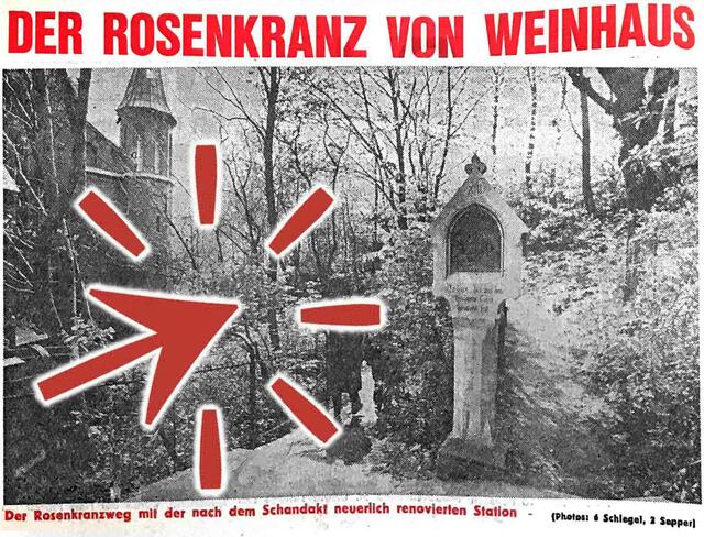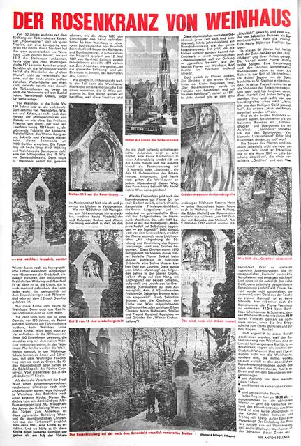 Am 7. Mai 1972 wurde erstmals über „unbesetzte Landpfarren“ diskutiert und am Beispiel „Ziersdorf“ im Norden die Zusammenlegung von fünf Gemeinden zu einer „Verbandspfarre“ vorgestellt. – Und Anton Fellner brachte eine Reportage über den „Rosenkranz von Weinhaus“, der durch einen Vandalenakt teilweise zerstört wurde. - Wieder renoviert war der Weg am Hang von der Genzgasse 142 in Richtung des Türkenschanzpark viele Jahre nur ein "Geheimtipp". Im September 2009 war der inzwischen wieder in die Jahre gekommene Rosenkranzweg dann durch einen tödlichen Unfall plötzlich wieder in den Schlagzeilen. "Eine arme Seele", wie es der damalige Pfarre formulierte, hatte einen Bildstock derart heftig umarmt, dass diese aus der Verankerung gerissen wurde und den Mann erschlug. - Ab 2013 wurden die Bildstöcke des Rosenkranzweges schließlich umfangreich renoviert und der Weg gilt seit 2016 zu den "Schönsten Kreuzwegen in Österreich".