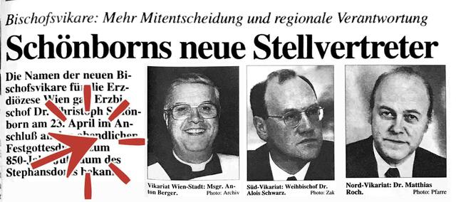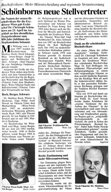 Am 4. Mai 1997 berichteten wir vom Festgottesdienst zum Domjubiläum, in dessen Anschluss der Erzbischof die Namen der neuen Bischofsvikare bekannt gab: Dr. Matthias Roch, Pfarrer in Stockerau, folgte in dieser Funktion auf Prälat Josef Nowak, Weihbischof Dr. Alois Schwarz wurde zum Nachfolger von Karl Hoffegger bestimmt und Msgr. Anton Berger in seiner Funktion für weitere fünf Jahre bestätigt.