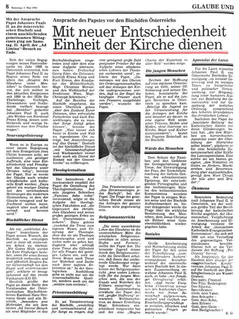 Am 3. Mai 1992 war in der Kirchenzeitung über den Ad-limina-Besuch der österreichischen Bischöfe vom in Rom und die Ansprache des Papstes zu lesen. Themen ware etwa "Neuevangelisierung", der bischöfliche Dienst, das Theologiestudium und die Ausbildung der Priester, der Religionsunterricht, die Jugend als Zeichen der Hoffnung, die "Würde des menschen" und soziale Themen sowie das Apostolat der laien und die Ökumene.