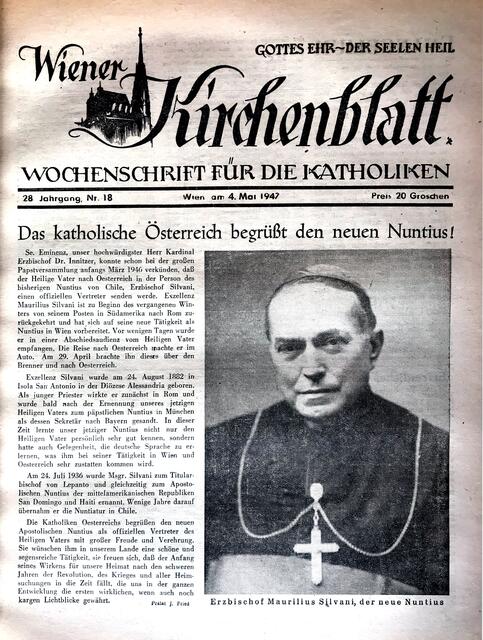 Am 4. Mai 1947 wurde im Kirchenblatt der neue Nuntius Erzbischof Maurilius Silvani begrüßt. Das Schottenstift kündigte mit kommendem Schuljahr die Gründung eines geistlichen Internats für zwölf Schüler an, die dann das Schottengymnasium besuchen werden; der Verein zur Förderung der Frauenbildung erinnerte daran, dass er sein 1938 geschlossenes Mädchen-Realgymnasium in Wien 3, Beatrixgasse 32 unter der Leitung der ehemaligen Direktorin Dr. Grete Höllering wiedereröffnen wird und der Wiener Domverlag änderte offiziell seinen Namen in WIENER DOMVERLAG Ges.m.b.H.
