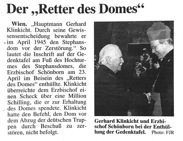 Am Rande des Domjubiläums wurde auch Gerhard Klinkicht, der „Retter des Domes“, mit einer Gedenktafel geehrt. Hauptmann Klinkicht hatte im April 1945 beim Abzug der deutschen Truppen aus Wien den Befehl zur Zerstörung des Domes verweigert.