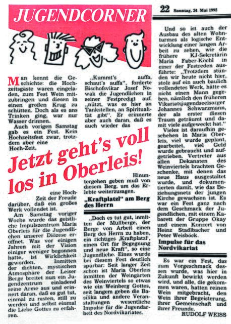 Am 24. Mai 1992 berichteten wir von der Kirchenzeitungs-Tagesfahrt durch Mähren, auf die uns viele Freunde der Kirchenzeitungs-Serie „Vergessene Wallfahrten“ begleiteten. Mit großer Freude stellte Rudi Weiß das neue geistlichen Jugendzentrums in Maria Oberleis vor. Unter dem Titel „ Ein neuer Weg zum erwachsenen Glauben“ erschien ein Artikel über den Europa Kongress des Neokatechumenats in Tulln, und wir stellten Josemaría Escrivá, den Gründer des Opus Dei und die ehemalige Sklavin und spätere Ordensfrau Josefine Bakhita anlässlich ihrer Seligsprechung von.