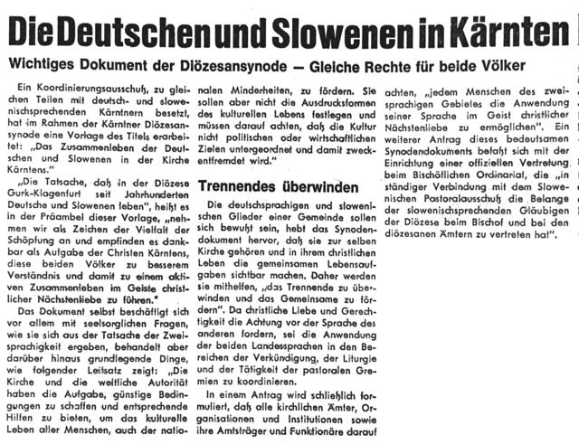 Am 28. Mai 1972, dem Dreifaltigkeitssonntag, wurde in der Kirchenzeitung versucht, das Geheimnis von „Gottes dreipersönlicher Liebe“ näher zu erklären. Weiters wurde von einem wichtigen Dokument der Kärntner Diözesansynode berichtet, das Deutschen wie Slowenen im seelsorglichen Bereich gleiche Rechte zusichert.