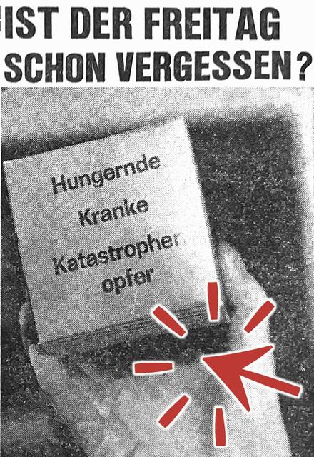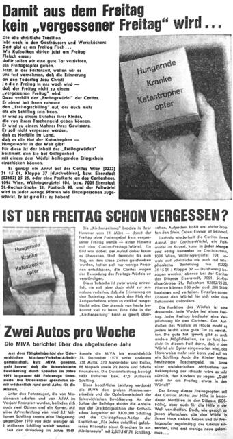 Weiters wurde erneut wurde an den „Caritas-Freitags-Würfel“ erinnert, nachdem dieses kleine Spendenbox bereits zu Beginn der Fastenzeit in Erinnerung gerufen wurde und damals auf wenig Interesse stieß. Dabei soll der kleine Kartonwürfel, der eigentlich in jeder Familie stehen sollte, an den Todestag Christi erinnern und einen Schiling als "Freitagsopfer" aufnehmen. - Was ist aber seither aus dieser Caritas-Spendenaktion geworden?