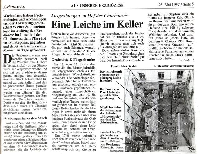 Am 25. Mai 1997 berichteten wir vom großen Glaubensfest am Nachmittag des Pfingsttages bei der Mariensäule am Hof, bei der auch der Weihe Österreichs an Maria vor 350 Jahren gedacht wurde. Wir brachten unter dem Titel „Eine Leiche im Keller“ einen Artikel über die Ausgrabungen im Innenhof des Churhauses, bei denen u.a. ein Priestergrab gefunden wurde.