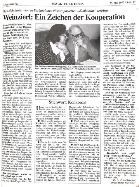 Und Historikerin Erika WEINZIERL erklärte in einem Interview, was sich hinter dem Wort „Konkordat“ verbirgt und welche Anstrengungen es bedurfte, um im Juni 1960 die Anerkennung des "Dolfuß-Konkordats" umzusetzen.