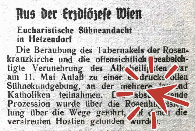 Am 25. Mai 1947, dem Pfingstfest, berichtete das Kirchenblatt von einer „eucharistischen Sühneandacht“ Mitte Mai in der Pfarre Hetzendorf. Grund dafür war die „Beraubung des Tabernakels der Rosenkranzkirche“ und die offensichtlich beabsichtigte Verunehrung des Allerheiligsten. Näheres dazu siehe das Faksimile!
