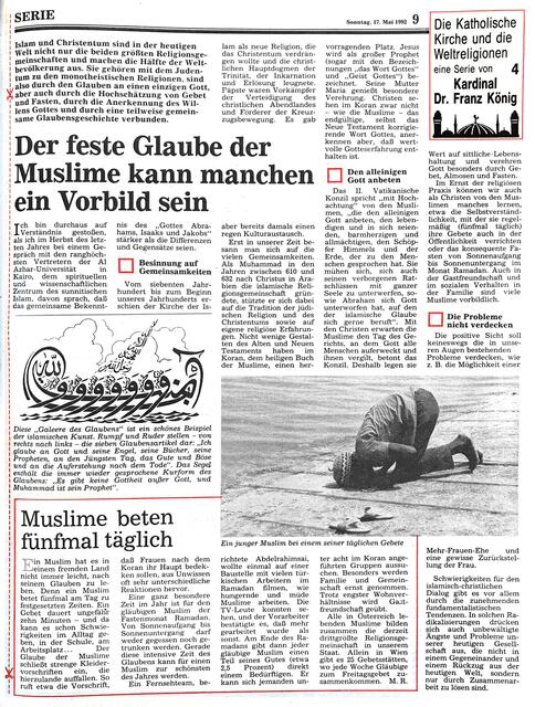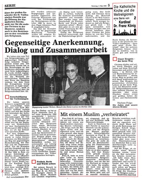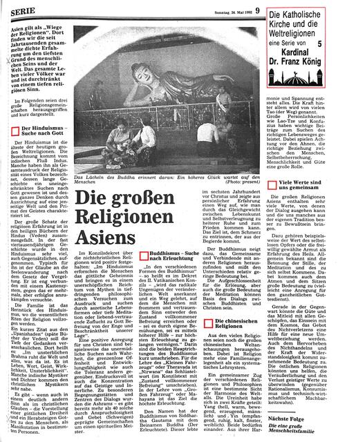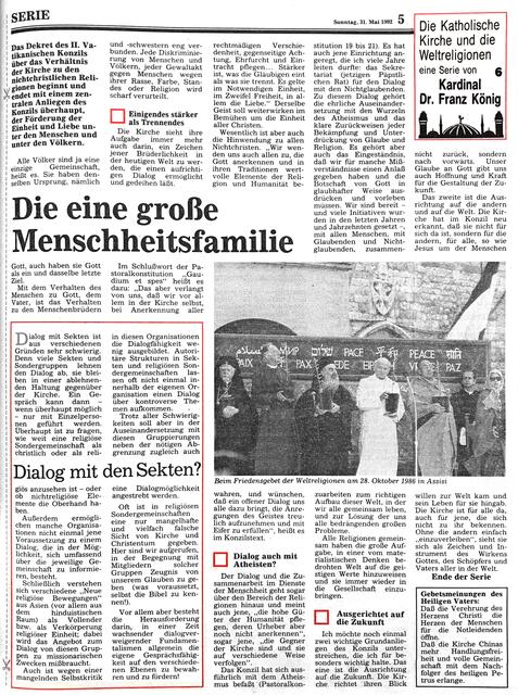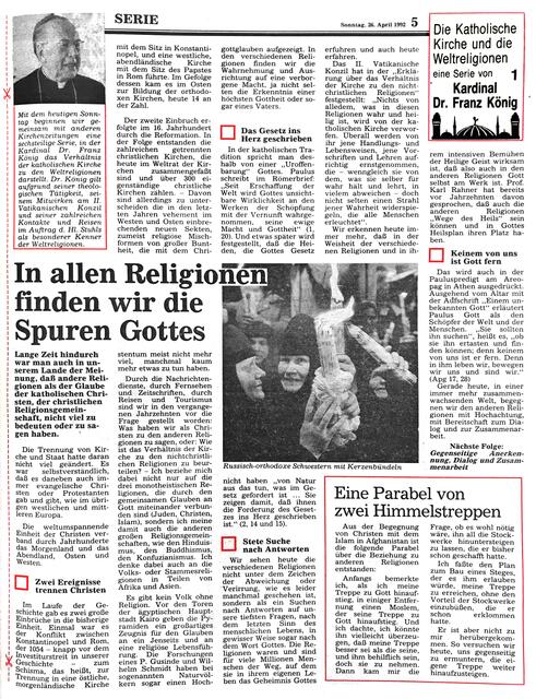 Zwischen Ostern und Pfingsten 1992 stellte Kardinal Dr. Franz König in sechs Folgen das Verhältnis der katholischen Kirche zu den Weltreligionen dar. Dr. König galt aufgrund seiner theologischen Tätigkeit, seinem Mitwirken am Il. Vatikanischen Konzil und seiner zahlreichen Kontakte und Reisen im Auftrag d. Hl. Stuhls als besonderer Kenner der Weltreligionen. Anbei die einzelnen Folgen im Faksimile - Anmerkungen und Ergänzungen erwünscht!