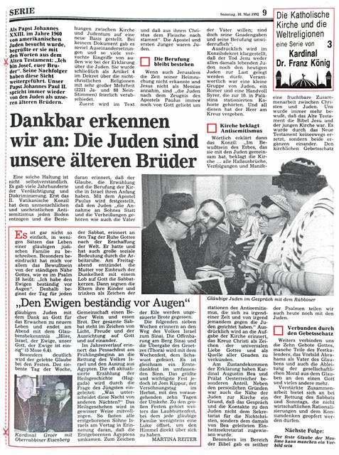 Eine solche Haltung ist nicht selbstverständlich. Es gab viele Jahrhunderte der Verdächtigung und Diskriminierung. Erst das II. Vatikanische Konzil hat dem unmenschlichen und unchristlichen Antisemitismus jeden Boden entzogen und die Beziehungen zwischen Kirche und Judentum auf eine neue Basis gestellt. Bei keinem Dokument gab es soviel Auseinandersetzungen und so viele versuchte Eingriffe von außen wie bei der Erklärung über die Juden. Sie wurde schließlich als Artikel 4 im Dekret über die nichtchristlichen Religionen mit sehr großer Mehrheit (2221 Ja- und 88 NeinStimmen) feierlich verabschiedet.