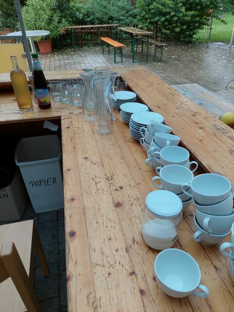 Für den letzten Termin am 6. August erwarteten wir zwischen 50 und 60 Personen. Leider war an diesem Tag lang anhaltender und schwerer Regen. Trotz dieser widrigen Wetterverhältnisse haben wir mit den Vorbereitungen begonnen und durften ab ca. 15 Uhr die ersten Gäste begrüßen. Leider hat das Mutter-Kind Haus Frieda abgesagt, da das Wetter zu schlecht war. Aber wir konnten an diesem Tag über 20Personen begrüßen. Zu diesem Termin waren fast genauso viele Helfer, wie Besucher anwesend, was uns im Team sehr freute.